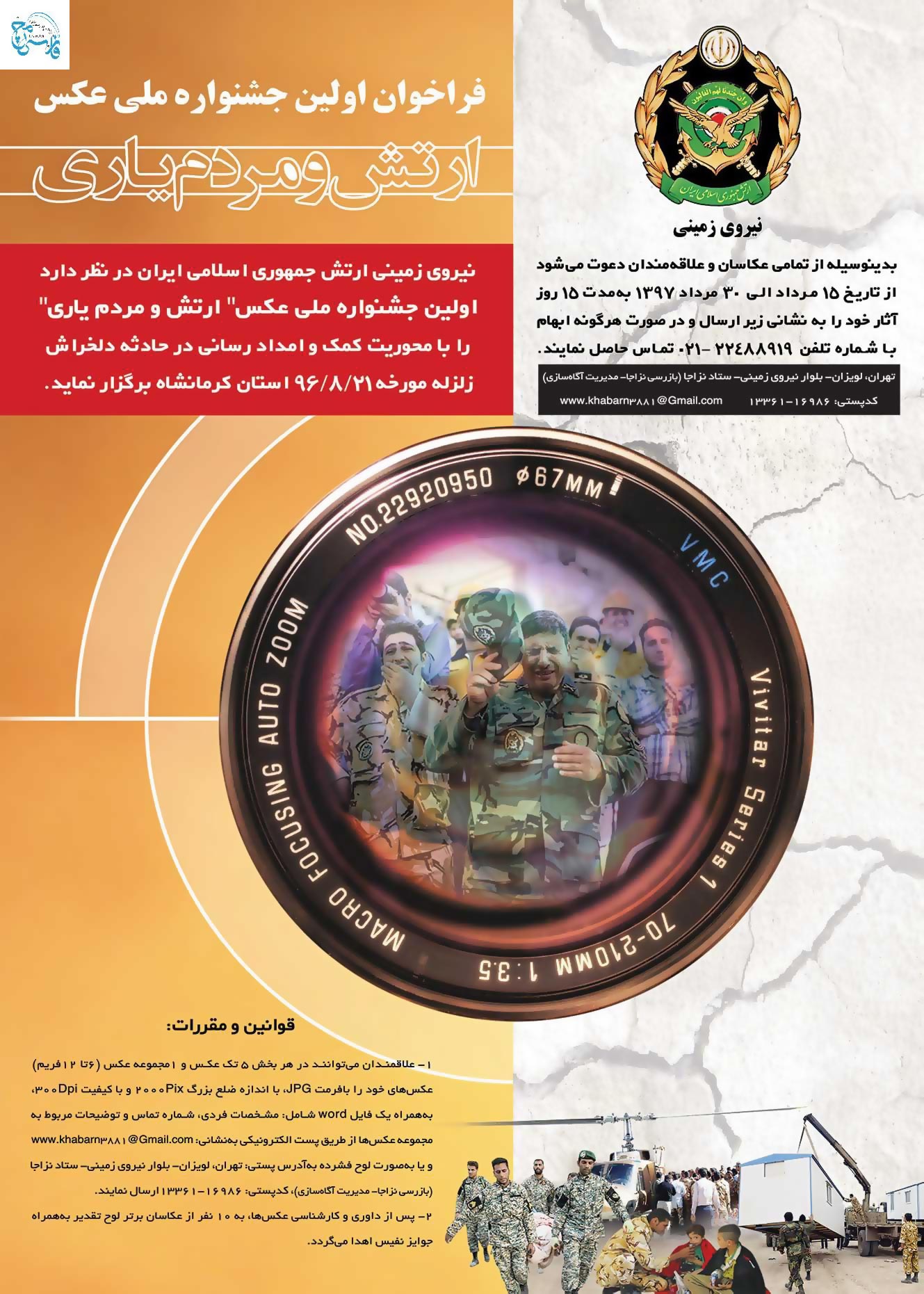 نیروی زمینی ارتش جمهوری اسلامی ایران در نظر دارد اولین جشنواره ملی عکس ارتش و مردمیاری را با محوریت کمک و امدادرسانی در حادثه دلخراش زلزله مورخه 21/8/96 استان کرمانشاه برگزار کند.