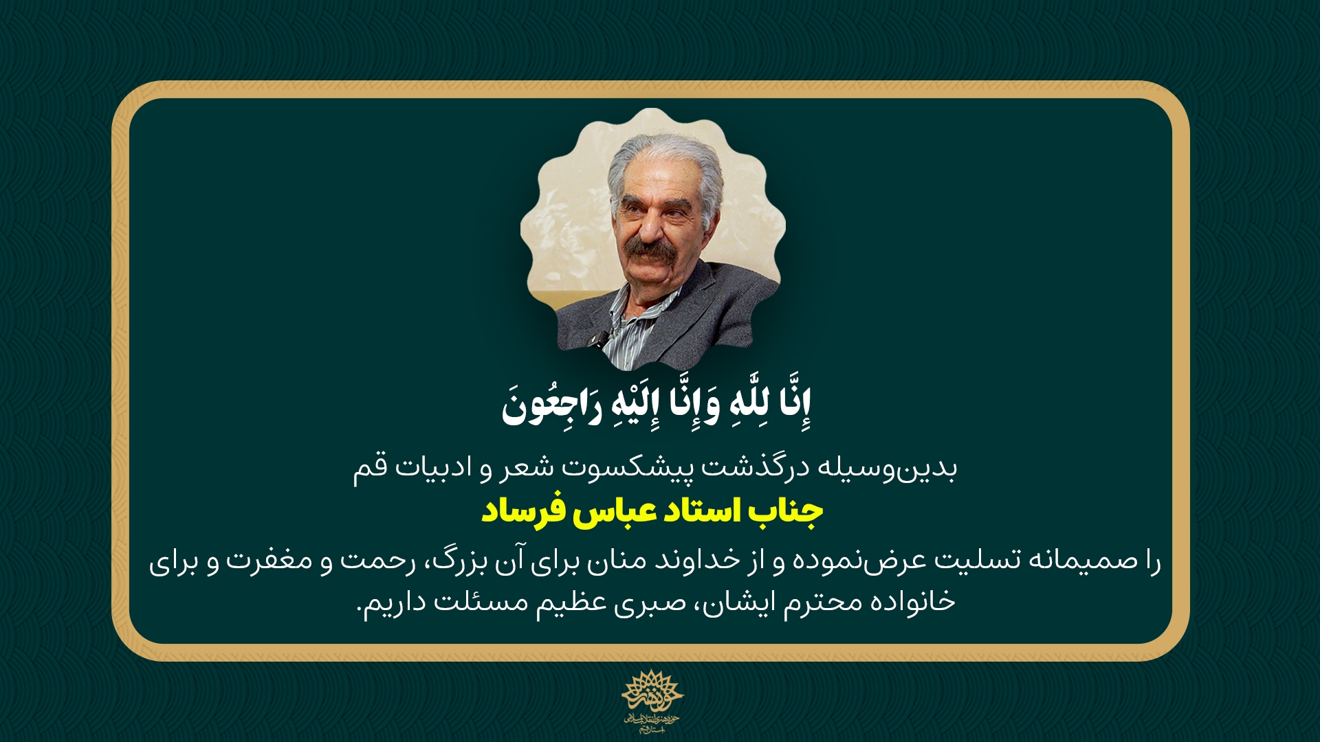 بدینوسیله درگذشت پیشکسوت شعر و ادبیات قم جناب استاد عباس فرساد را خدمت عموم مردم و جامعه هنری قم صمیمانه تسلیت عرضنموده و از خداوند منان برای آن بزرگ، رحمت و مغفرت و برای خانواده محترم ایشان، صبری عظیم مسئلت داریم.