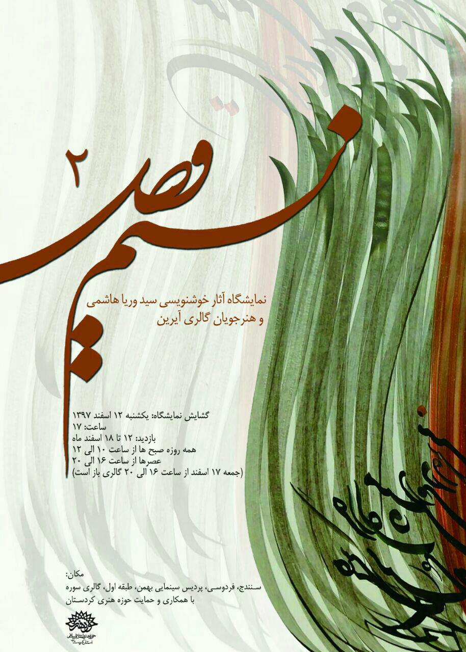 وی با اشاره به ظرفیت های بالای هنری در استان افزود : نمایشگاه نسیم وصال 2 مجموعه ای از آثار جدید بنده با گرایش نوین و تلفیقی از خوشنویسی و رنگ که جنبه نقاشی خط به خود گرفته است در کنار آثاری از 13 هنرجوی کلاس های برگزار شده است که در مجموع با 25 تابلو از یکشنبه 12 اسفند ماه تا جمعه 17 اسفند آماده بازدید علاقه مندان خواهد بود.
