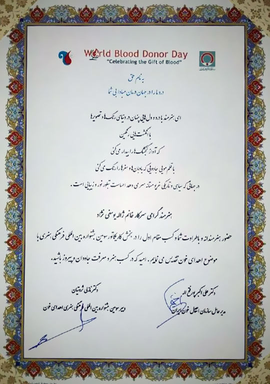 به گزارش روابط عمومی مرکز تجسمی حوزه هنری، درادامه موفقیتهای هنرمندان خانه کاریکاتور حوزه هنری کردستان، ژاله یوسفینژاد از هنرمندان عضو این خانه، رتبه اول بخش کاریکاتور سومین جشنواره بین المللی فرهنگی هنری با موضوع «اهدای خون» که با شعار «دردها را در جهان درمان مبادا بی شما» برگزار شد را به خود اختصاص داد.