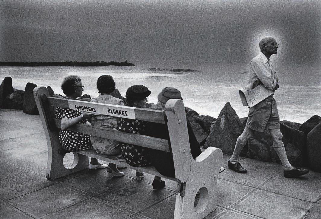 هنگامی که "السکن" در دوربانِ آفریقای جنوبی بود، این صحنه ی گویا را در یک گردشگاهِ کناردریا به تصویر کشید. چهار زنِ سالخورده، غرق در گفتگو بر نیمکت سیمانی روباز نشسته اند و مردی در سکوت، زیر آسمانِ تیره و طوفانی می گذرد. شاید اطراف سر مرد، توسط "السکن" و در تاریک خانه روشن تر شده، تا در برابر زمینه ی لکه دار و خشن تصویر، برجسته به نظر بیاید. کلمات حک شده بر پشت نیمکت (نیمکت اروپایی ها)، به عکس مفهوم سیاسی داده است، چون زنان را به عنوان نماینده ی نظام آپارتاید (تبعیض نژادی)، و بهره بردارانِ تفکیک نژادی معرفی می کند.
